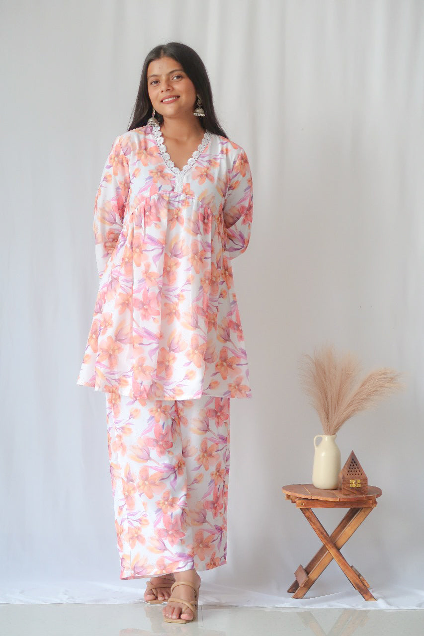 Experience timeless elegance with the Nazakat Collection’s stunning georgette suit set. The knee-length alia cut peplum kurti, designed in a graceful frock style, features a V-neck adorned with intricate lace detailing that extends beautifully onto the full-length sleeves. The off-white base is elegantly decorated with vibrant orange and purple florals, along with leafy prints, creating a refreshing and sophisticated look.