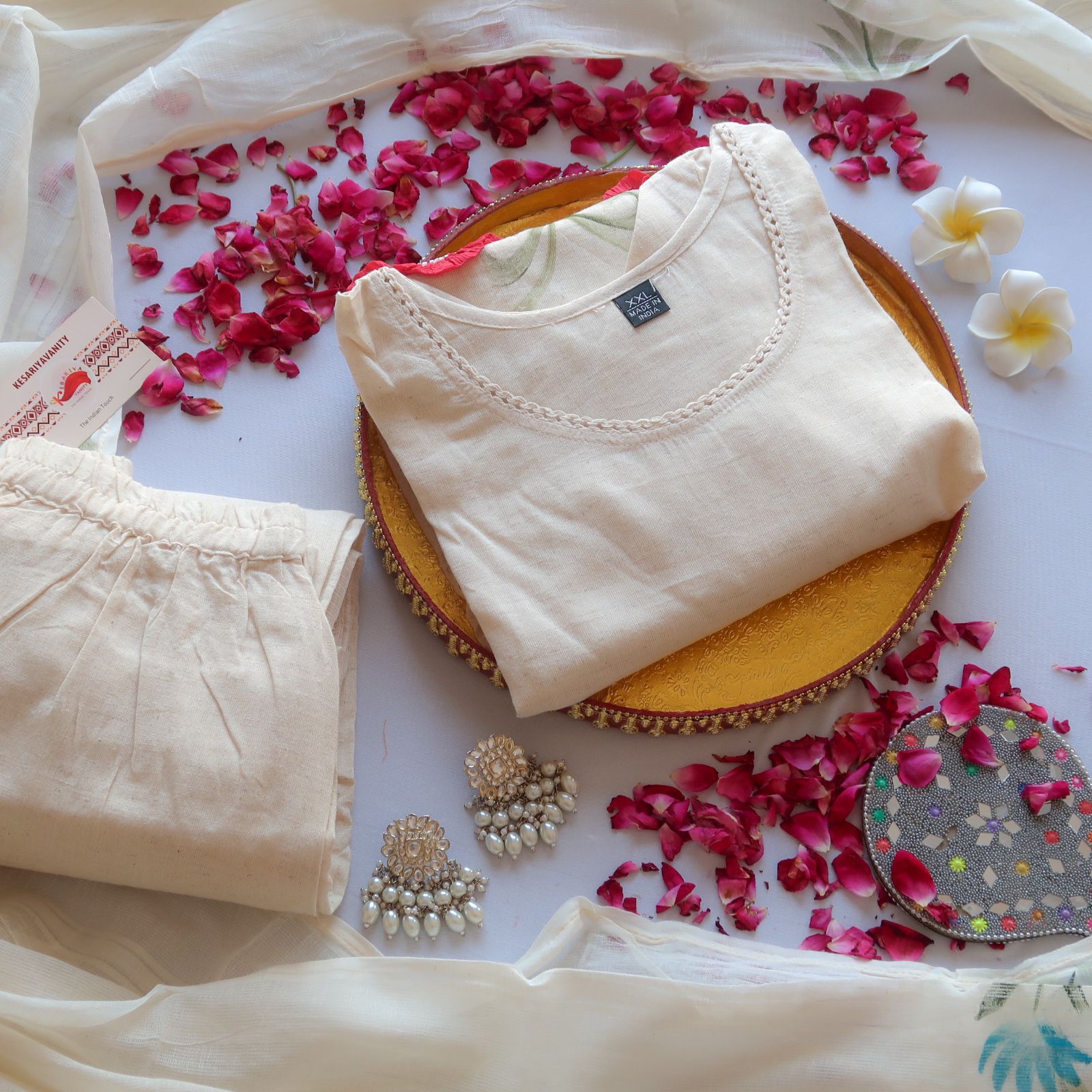 Introducing our Premium Three-Piece "Floral Whisper Suit Set," an exquisite blend of elegance and charm perfect for any occasion. The kurta features a soft off-white base color adorned with delicate floral prints at the hem, creating a fresh and feminine touch. Paired with matching off-white plain pants, this set offers a seamless and sophisticated look.
